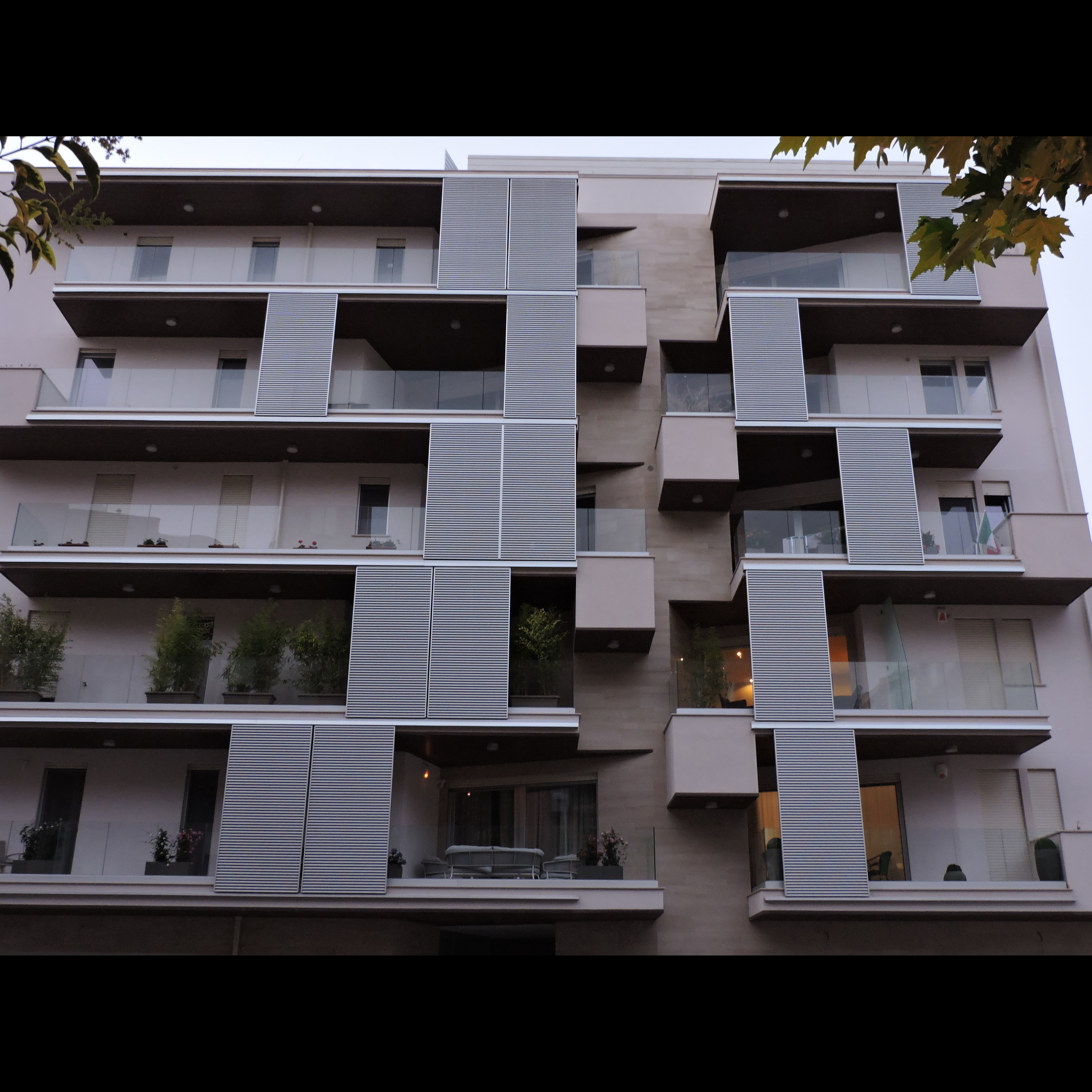 I prospetti sono stati integralmente ridisegnati, revisionando il sistema delle bucature e degli aggetti, aggiungendo nuovi elementi funzionali e modificando radicalmente i materiali di finitura: pitture dai toni tenui, rivestimento effetto travertino tagliato in falda, legno wpc, vetro fumé e alluminio verniciato in bianco per conferire all’edificio un’immagine completamente rinnovata e pienamente contemporanea.