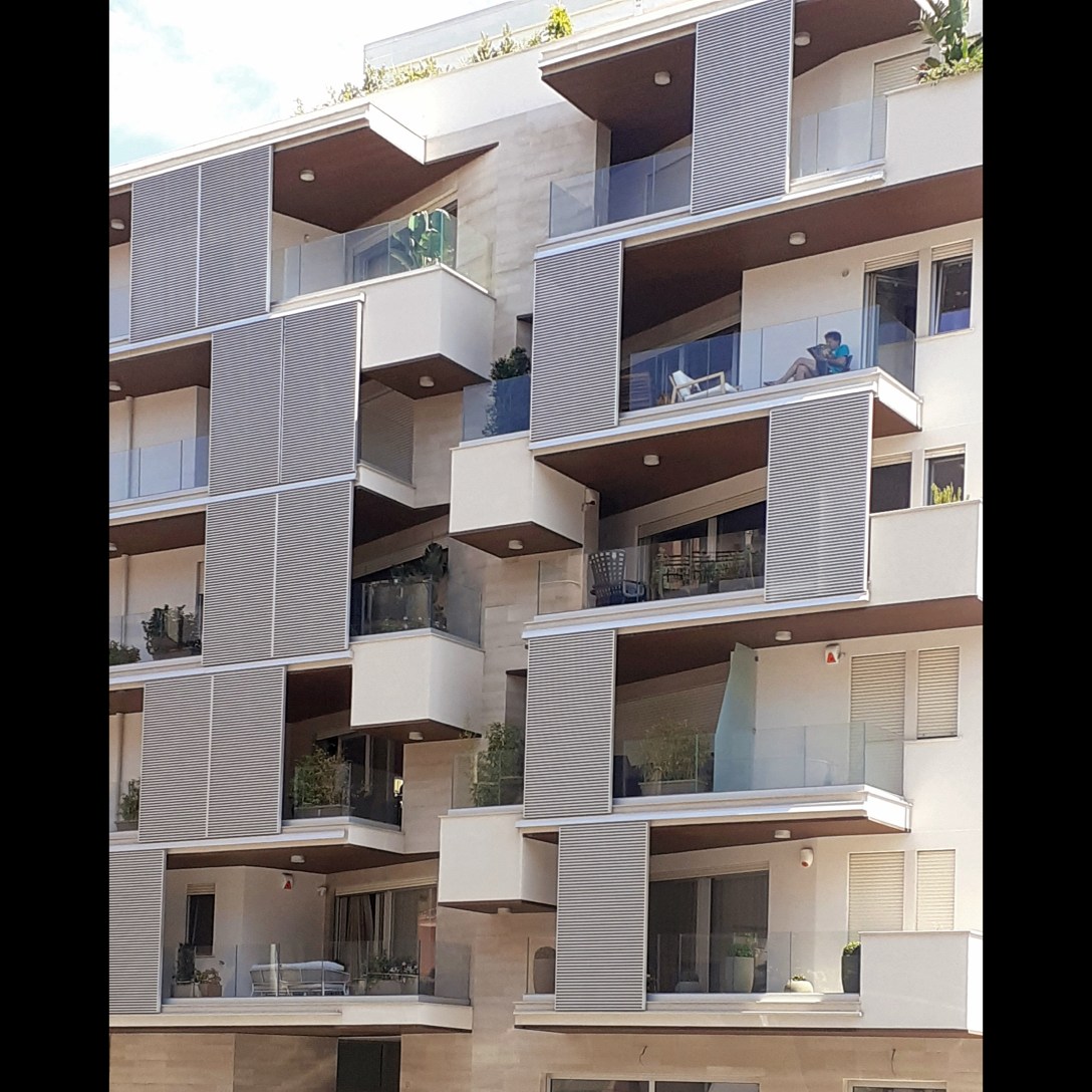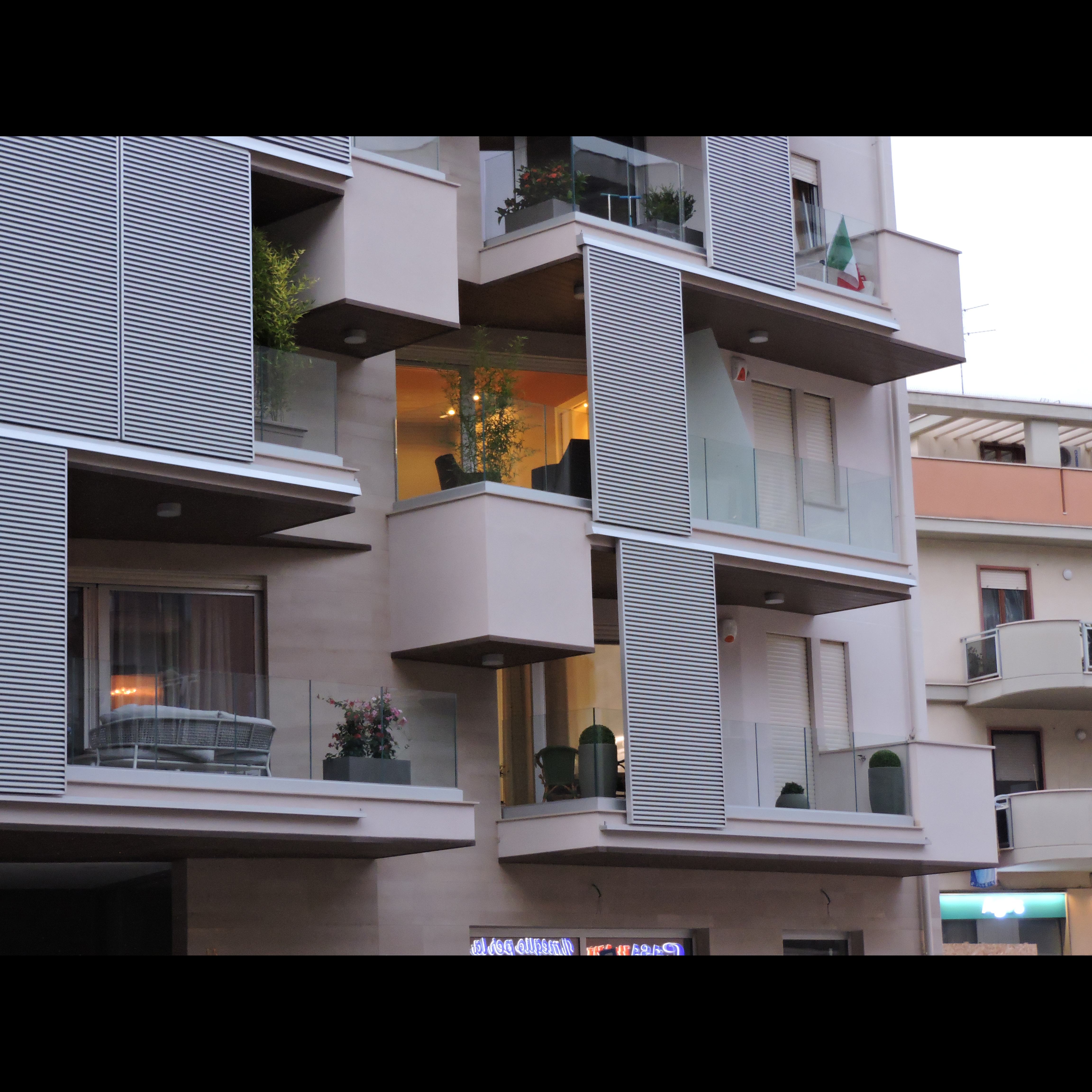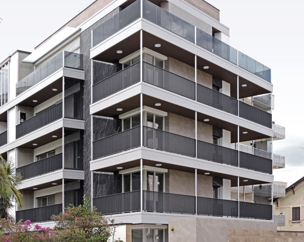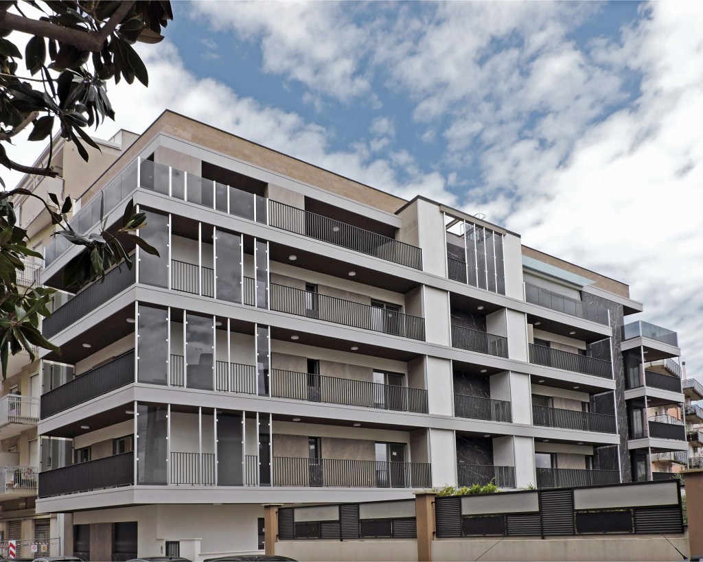 Un edificio di nuova costruzione incastonato nel tessuto urbano consolidato di Trani. Il vetro dei parapetti e l’alluminio di frangisole e infissi dialogano con la pietra locale, l’intonaco bianco e il legno, alla ricerca dell’equilibrio fra un linguaggio pienamente contemporaneo ed il calore tipicamente mediterraneo. Nove fioriere pensili, di cui quattro appese, sono predisposte per accogliere alberi a basso fusto sulla facciata. Linee minimali come sintesi dell’identità del luogo.
