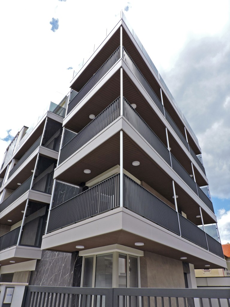 L’edificio, anche a causa del suo inserimento urbanistico, si rivolge al mare con un cantone acuto, valorizzato dal completo “svuotamento” dell’involucro mediante vetrate d’angolo a tutta altezza. I rivestimenti in legno wpc degli intradossi degli aggetti, insieme ai pali in acciaio inox, alludono all’architettura navale, creando la sensazione di osservare il “ponte rovescio” di una imbarcazione.