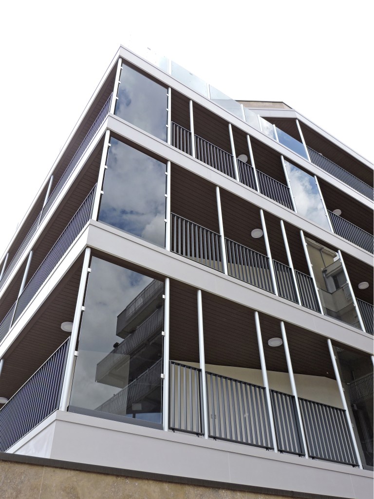 Il sistema dei parapetti e delle paratie in vetro a tutta altezza costituisce una sorta di extra-involucro che dialoga con l’involucro edilizio principale, a sua volta ritmato dal sistema della bucature e dai rivestimenti. Il contrasto fra la finitura opaca dei rivestimenti e la lucentezza delle paratie in vetro (sulle quali si muovono i mutevoli riflessi del cielo) contribuisce a conferire profondità e leggerezza ai prospetti della costruzione, la quale si relaziona con lo spazio urbano con effetti sempre mutevoli e sorprendenti in base alle condizioni di luce.