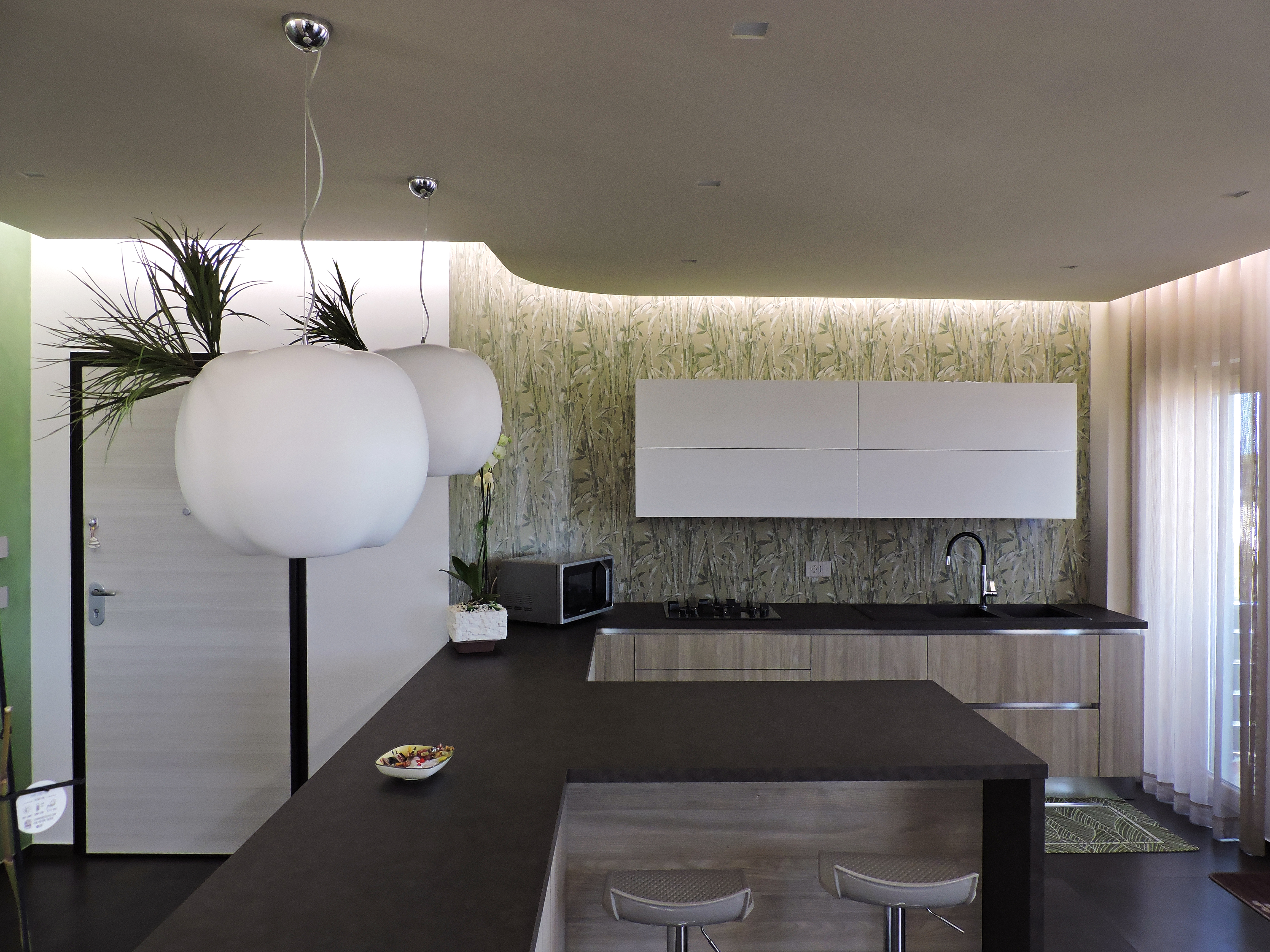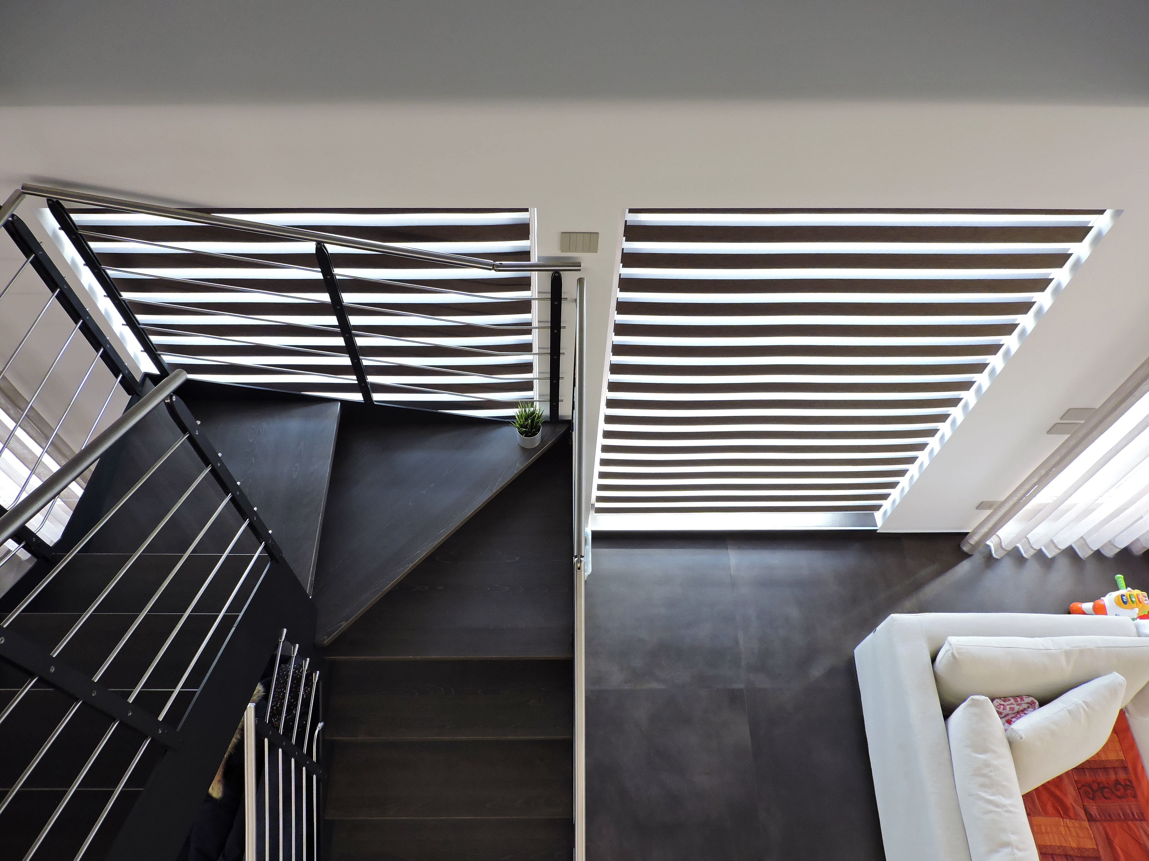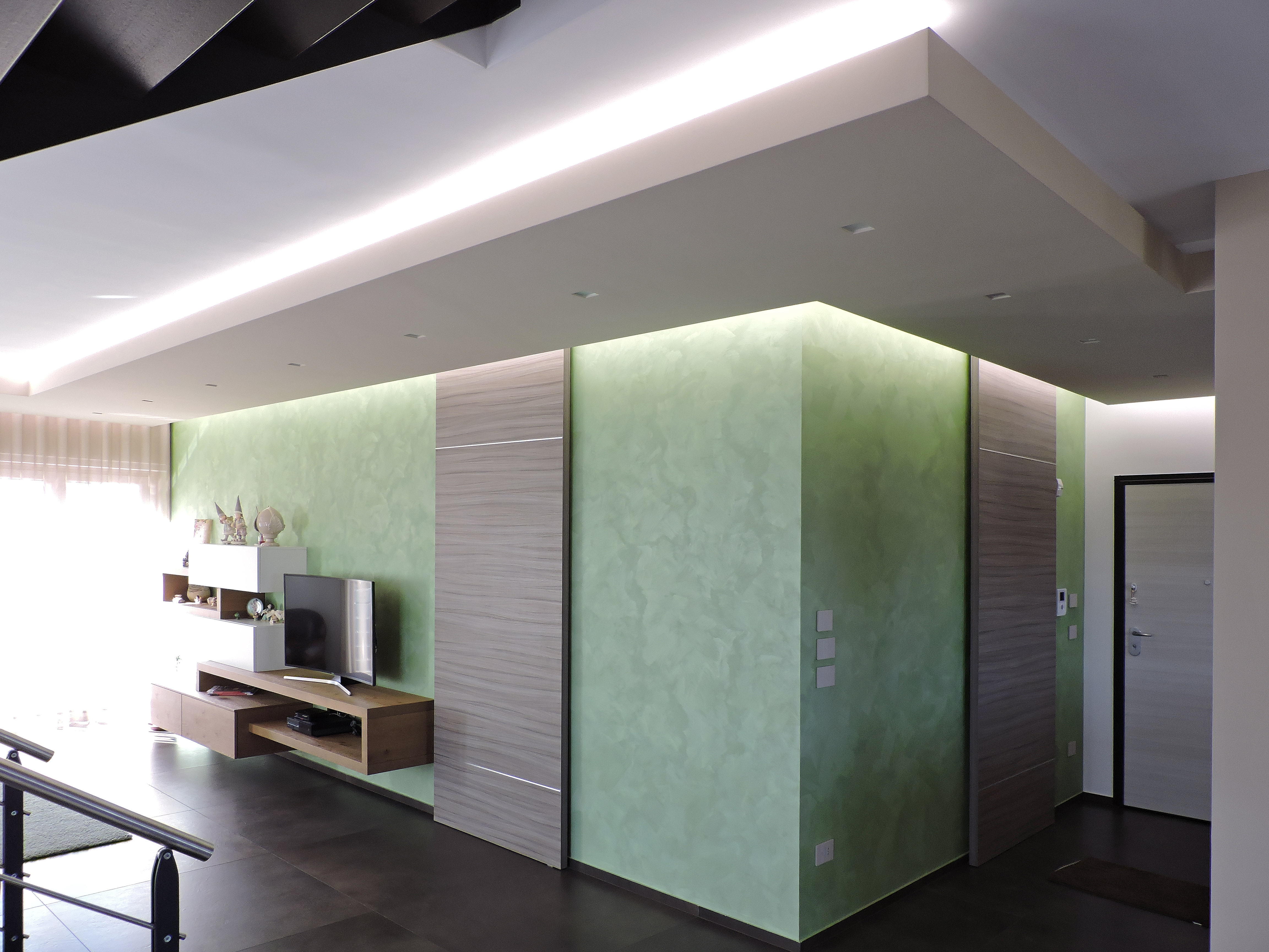 Dalla richiesta della committenza di differenziare le pavimentazioni sui due piani (lastre di grés nella zona giorno e parquet nella zona notte) è derivata la scelta progettuale di lavorare con due registri cromatici differenti, uno più elegante e minimale per la zona giorno, caratterizzata da contrasti cromatici molto netti, e l’altro più caldo per la zona notte, dove le cromie sono più morbide e armoniose.