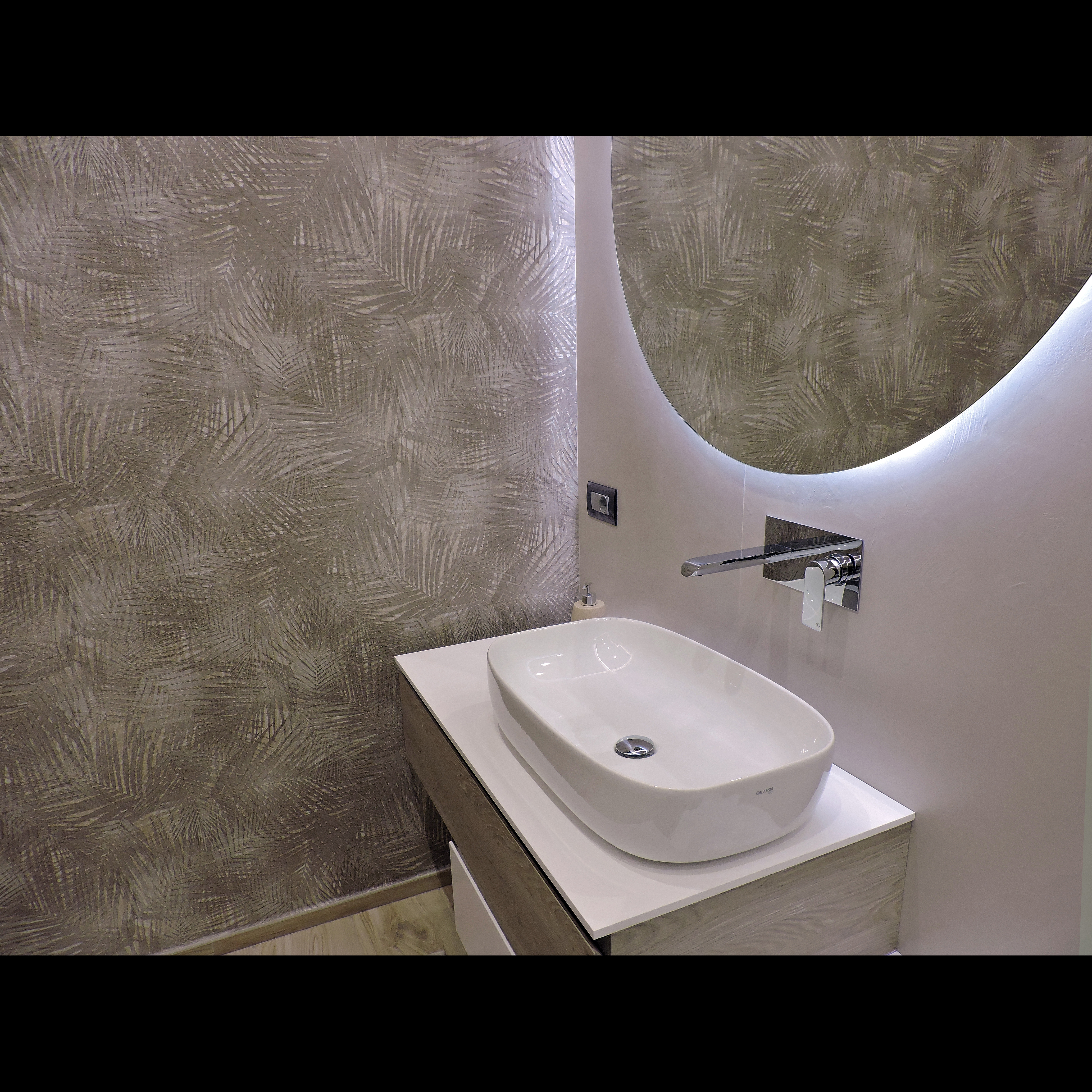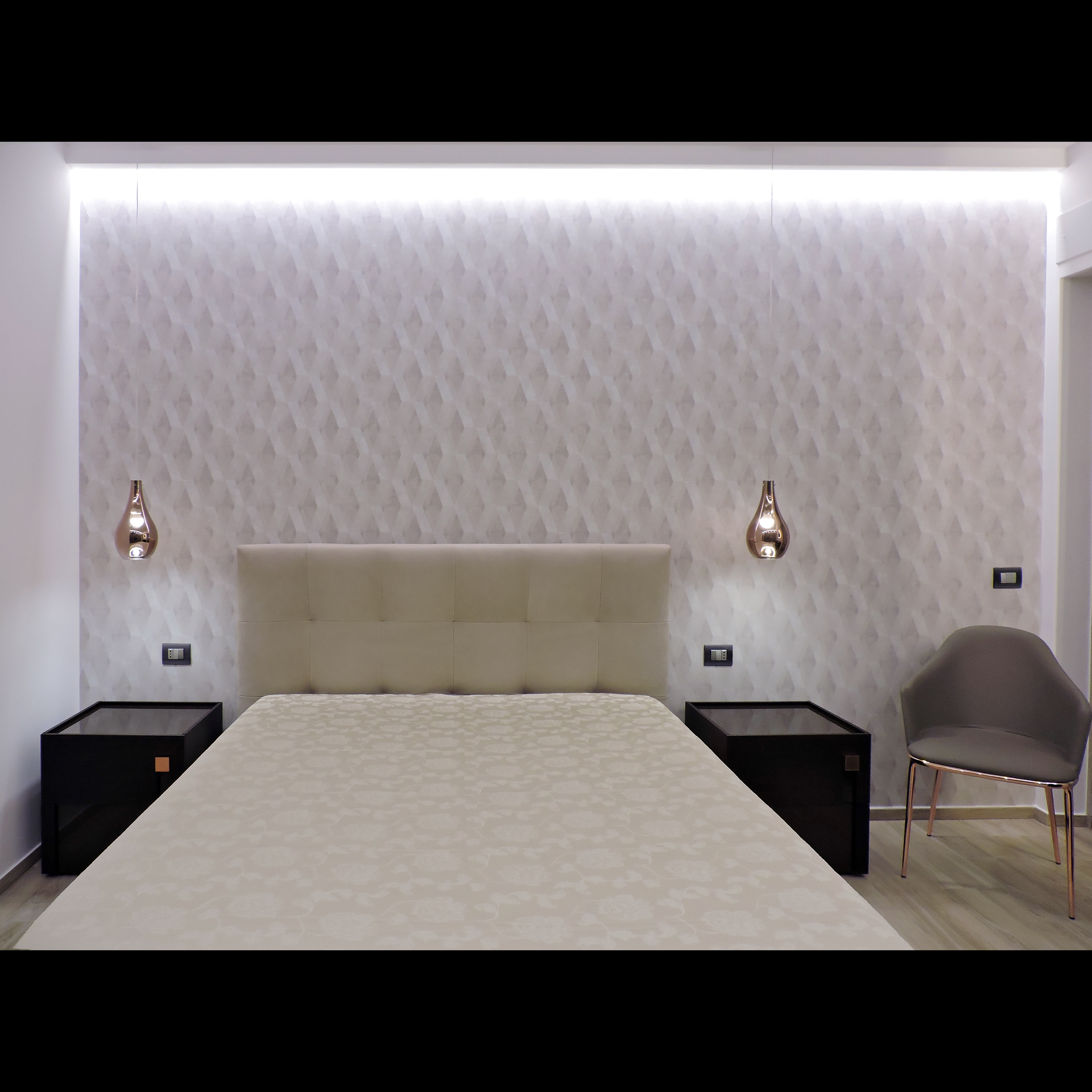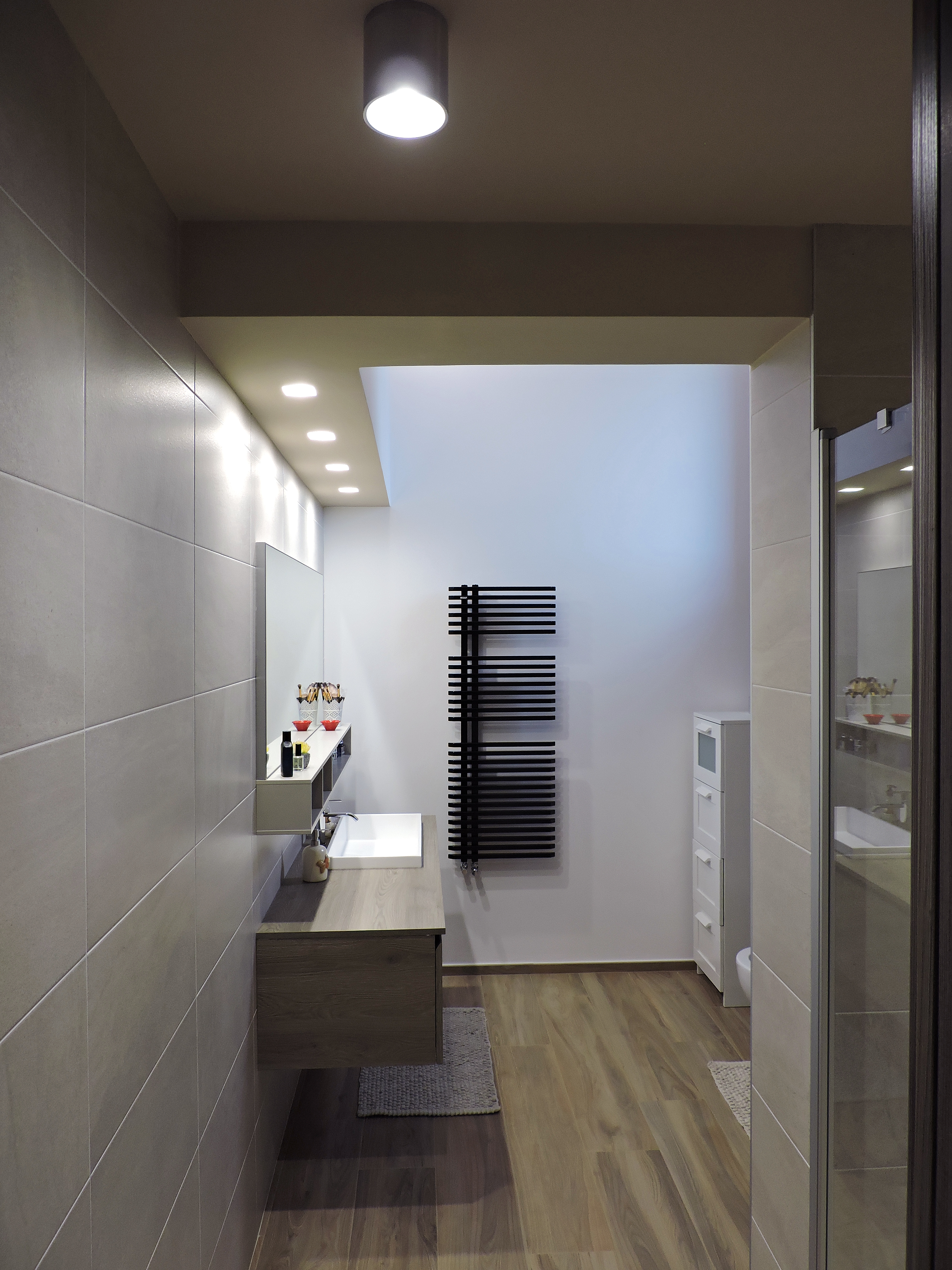 Il primo piano, accessibile mediante scala o ascensore interno, è dedicato alla zona notte, composta da una camera doppia, una camera padronale con bagno in camera e un bagno con vasca freestanding. Il tutto distribuito intorno al disimpegno-ballatoio su cui sbarcano la scala e l’ascensore, caratterizzato da un’intensa illuminazione artificiale zenitale a effetto lucernaio.