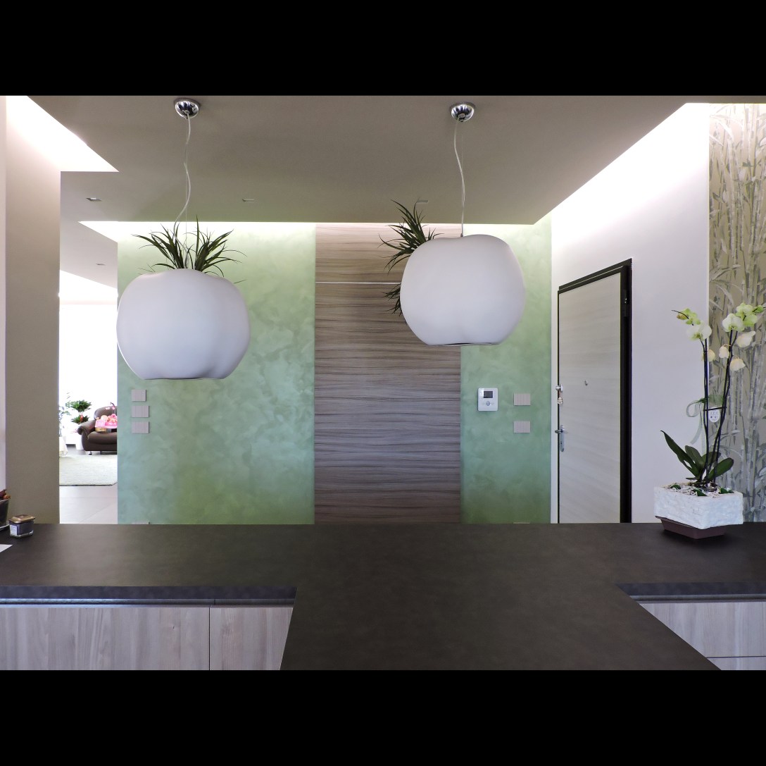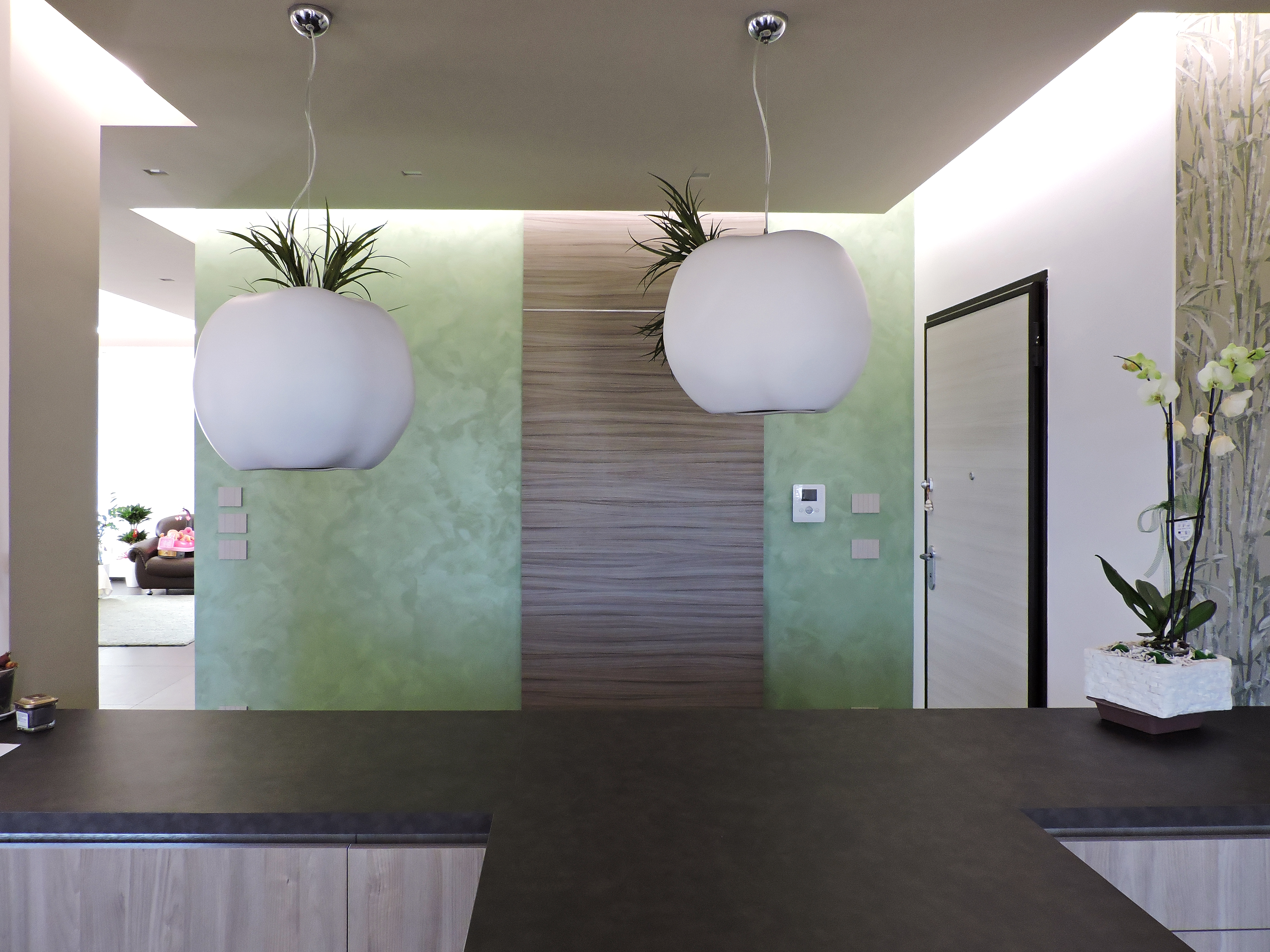 Il piano terra è dedicato alla zona giorno, composta da: un vano di ingresso, caratterizzato da una cappottiera a tutta altezza con ante a specchio; il soggiorno, caratterizzato da una parete attrezzata con biocamino rifinita a resina; un bagno ospiti, con finiture in resina e lastre di grès a tutta altezza; la cucina-sala da pranzo, separata dal soggiorno mediante una vetrata scorrevole a tutta altezza che, una volta aperta completamente, consente di ricostituire la continuità spaziale tipica dell’open space.